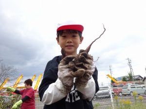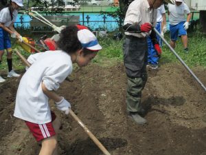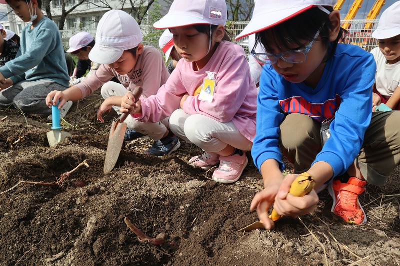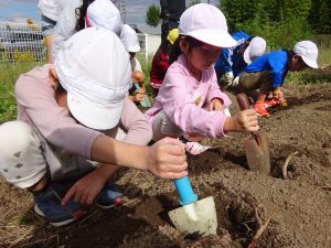 スコップや軍手で掘り進めますが、「土が硬い…。」「掘れない…。」と苦戦をする子どもたち。