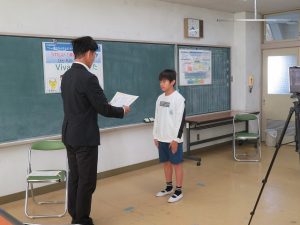 今朝の児童朝会は、後期児童会委員会委員長の認証式でした。