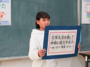 代表委員長さんが、今年度の児童会目標とそれについて自分の願いを語りました。特に、「あいさつ」を大切にしたいという内容だと聴きとりました。