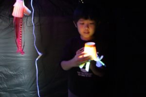 蛍光の素材で作っているので、ブラックライトテントの中でどう光るか確認しながらの作業。