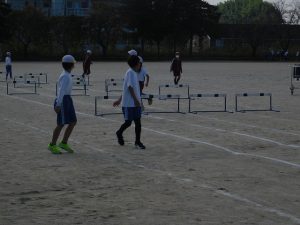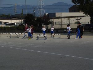 係の大きな声で準備体操をしていました。また、カラーコーンが次々に並べられていきました。