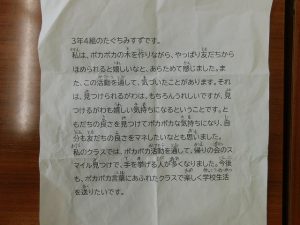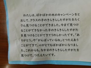 全校で取り組んだ「ぽかぽかの木」について話しました。