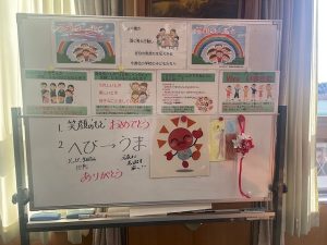 朝会はオンラインです。この掲示をバックに話しました。