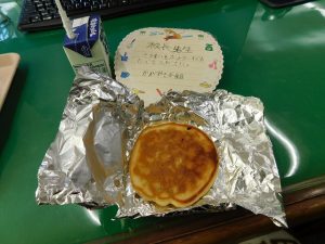 かがやき農園で収穫したサツマイモをつかった「さつまいもホットケーキ」を届けてくれたのです。