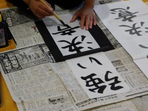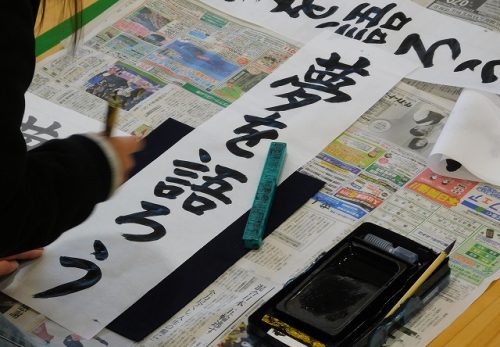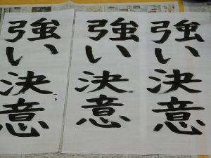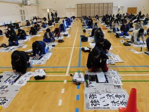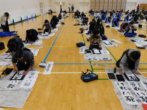 体育館に入ってみると、「春の海」が流れ、既に何枚か書き上げている場面でした。