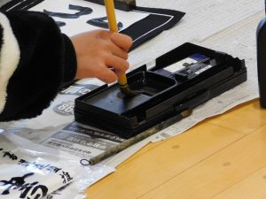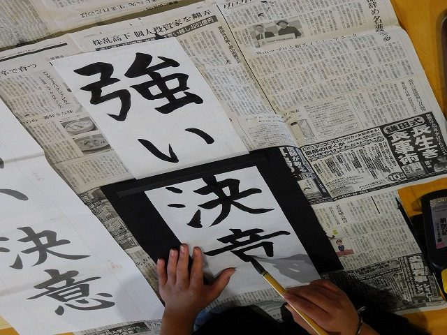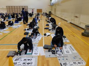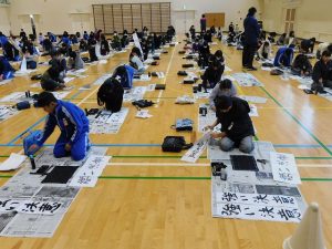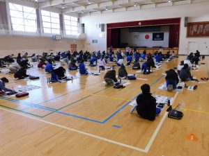 今日の1・2時間目に5年生は体育館で書初め会を行いました。