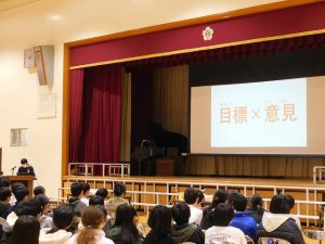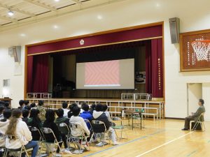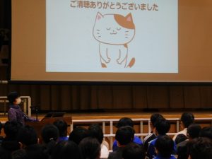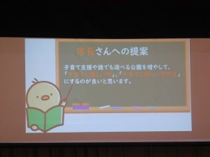 子どもたちは、スクリーンと発表者に注目しています。市長さんは、真剣にみんなの発表を聴いてくださっていました。うれしいですね。