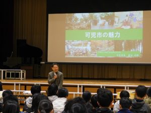 6年生が総合的な学習の時間を中心に学んできたことを、可児市長さんをお招きして提案しました。