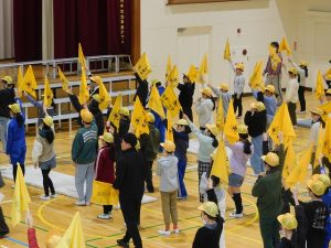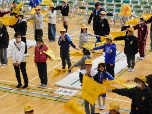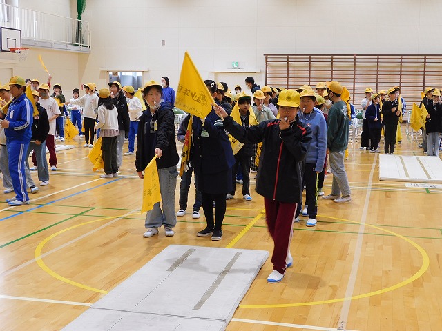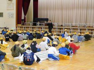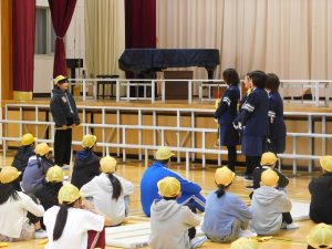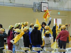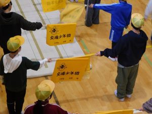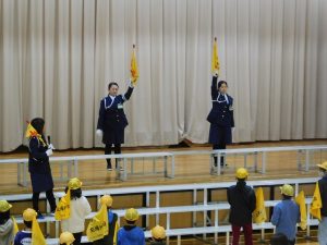 今日、ロング昼休みに、交通安全指導員様を講師として、分団登校時の旗と笛の使い方を学ぶ「バトンタッチ・リーダー会」を行いました。