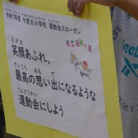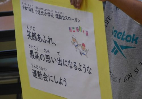 今朝は児童朝会 前半は代表委員から、運動会スローガンと日常の取り組みの発表…