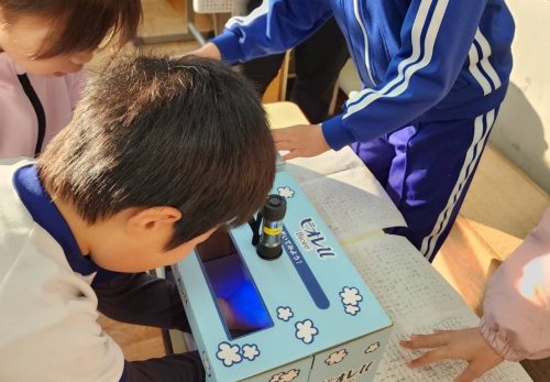 次の写真は1年生教室です。実際に実験してみて、自分の手のどのあたりがよく洗えていて、どのあたりをもっと丁寧に洗った方がよいかを確認しました。