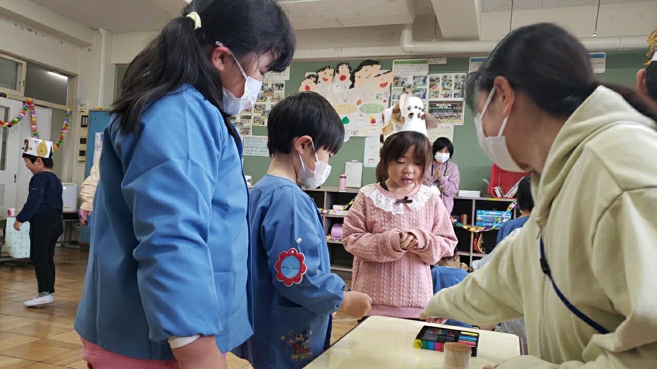 音楽室から体育館に移動すると、新しい譜面に書き込んでいる様子が見えました。5年生・4年生が3年生に教えている姿もありました。