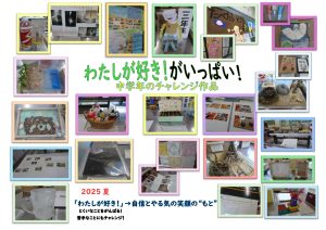 朝から、校庭にはたくさんのトンボが飛んでいます。暑くても確実に季節が変わっているんですね。今、夏休みのチャレンジ作品展を行っています。夏休み中に取り組んだ作品、力作が勢ぞろいです。どの作品にも、一人一人の想いがこもっています。成長も感じます。明日までの開催です。ぜひ、実物もご覧になってください。