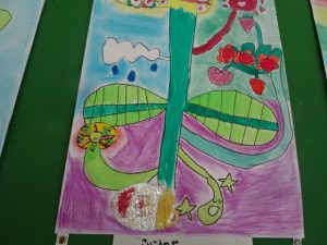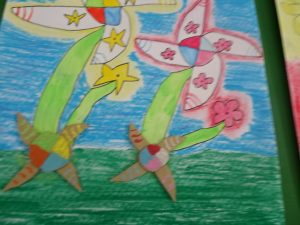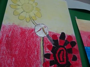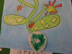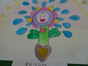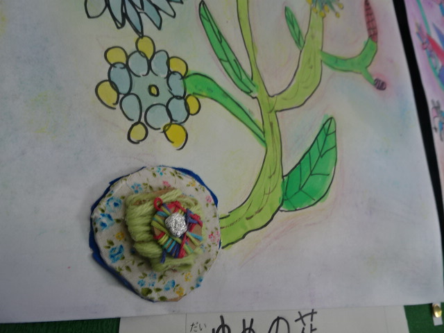 3,4年生の廊下の掲示板に、「いろんな花を咲かせた不思議なたね」の作品が並んでいました。