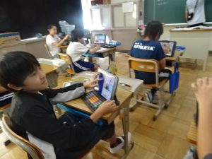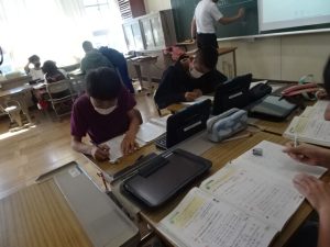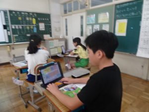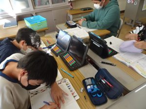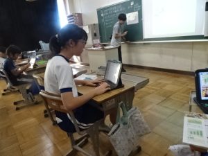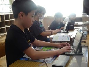 5年生は、社会科の「これからの食糧生産とわたしたち」の学習、タブレットで資料を選びながら学習を進めていました。キーボードをたたいて入力する指の速さに驚きです。