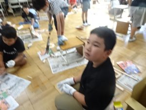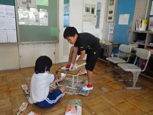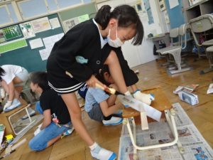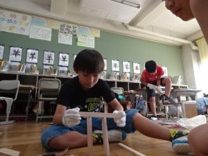 3,4年生が図工の「のこぎりギコギコ」の学習で、のこぎりを使って木材を切る活動をしました。まっすぐ切らないとこの後の組み立てが大変です。仲間と協力して慎重に進めます。