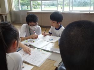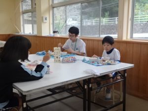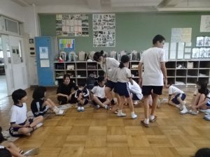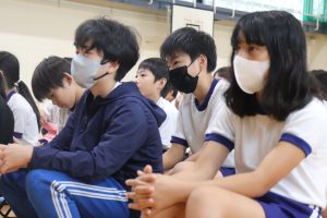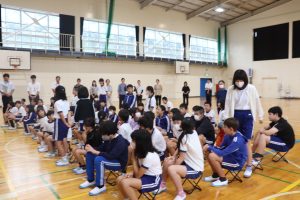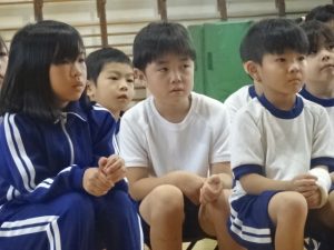 最後に今日明日の二日間、職場体験に来ている共和中学校の2年生4名の生徒さんが、あいさつをしました。さっそく学習・遊び・給食で、兼山っ子たちと積極的に関わってくれました。