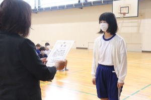 式の後、読書感想文コンクール、社会科作品展、科学作品展の入賞者の表彰を行いました。