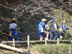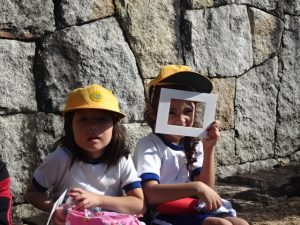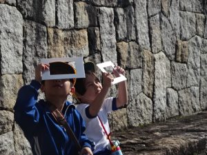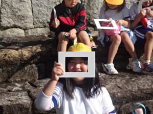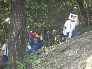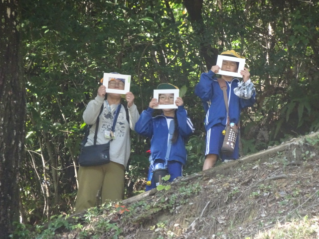 1.2年生が古城山でネイチャーゲームの活動をしました。今回も、ゲストティーチャーのはらねえさんとみみさんが一緒に活動してくださいました。白い枠を額縁に見立てて、秋の風景を切り取り!展望台の近くまで秋の自然を見つけに出かけました。