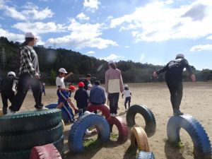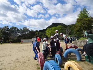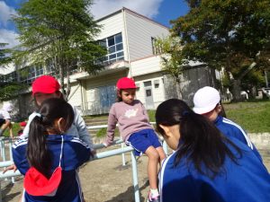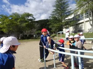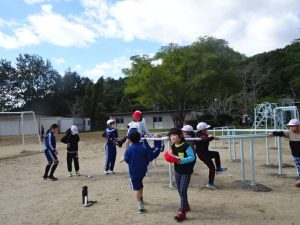 青空の時間は、日差したっぷりの暖かい中、今日は、2年6年、3年5年、1年4年のペア学年で遊びました。