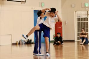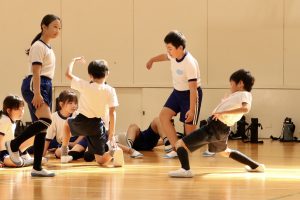 音楽に合わせてストップモーションしたり、動きのリレーをしたり・・・、