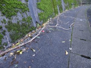 今朝の城戸坂、吐く息が白く見えるほど冷えました。連休中の強風で歩道には枯れ枝が落ちていました。
