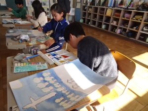 学習の様子です。物語の絵を制作中の5年生、自分の描いている構図を思い浮かべながら、熱心に活動しています。