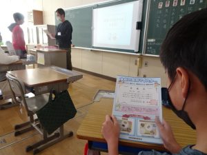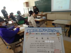 6年生は、学級活動で、給食センターの先生と食に関することを学びました。岐阜県では、1年生から学んできた食に関する知識や技能を生かして、県下すべての6年生が家庭の食育マイスター(食に関する名人、達人)に委嘱されます。任務はこれまで学んできたことを生かして、家庭の「食」をよりよくすること!