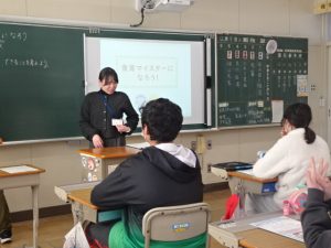 その後、自分の生活を振り返りクイズで食に関する知識を深めることで、自分でできることから家庭で挑戦することを宣言しました。6年生のご家族の皆様、ぜひご協力をお願いします。