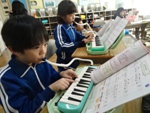 2年生は、2拍子・3拍子のリズムをうちながら、鍵盤ハーモニカの演奏練習を繰り返しました。