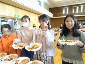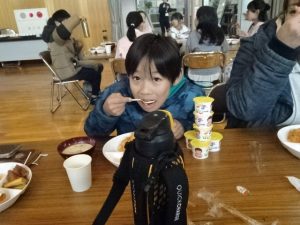 本日のメニューは、チキンライス・クリームシチュー・鶏の唐揚げ・さつまいもスティック・カップケーキ・ゼリー・乳酸菌飲料・・・と盛りだくさん!指名された兼山っ子の「いただきま~す!」でお食事スタートです。