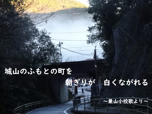 今朝の城戸坂、木曽川に朝霧が漂う、校歌の歌詞そのものの情景でした。落ち着いた町 兼山です。