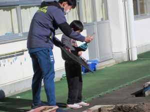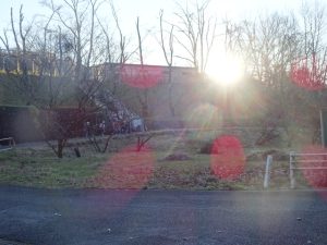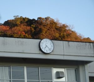 今日は、一年の中でお昼が一番短い冬至。7時23分、校庭には朝日がまだ届いていません。城戸坂からやってくる兼山っ子たちが西階段を登るころ光が届き始めました。おまけに今日は、駐車場の上り旗が開き切るほどの、とっても強い風の出迎えでした。