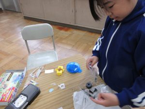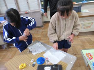 磁石の学習をしている3年生、磁石についた砂鉄に苦労していました。その苦労から、工夫が生まれます。
