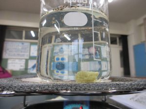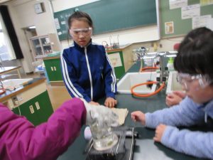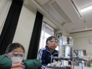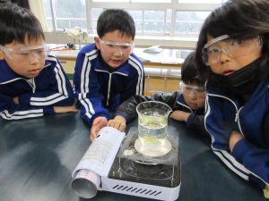 4年生は理科で水の温まり方の実験です。実験用メガネを着用して実験に臨みました。温められた水の動きが分かりやすいように、柚子胡椒を投入!教科書に書いてあることに驚きでした!