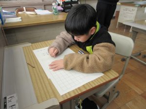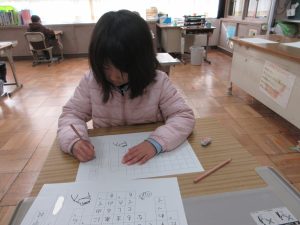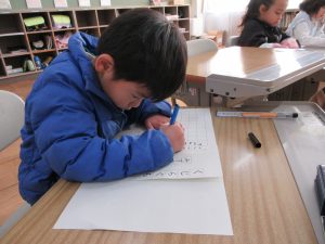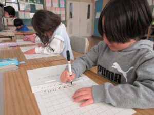 2時間目は、それぞれの教室で書初めです。1,2年生は硬筆、お手本を見て丁寧に書きました。