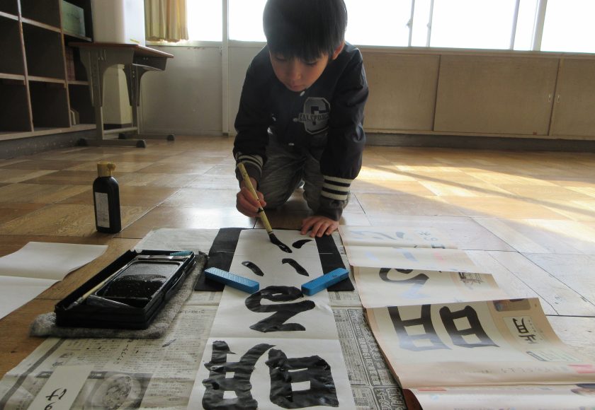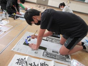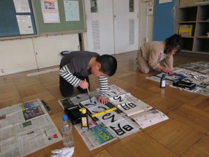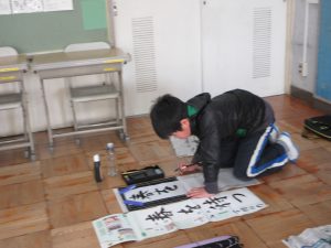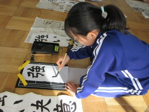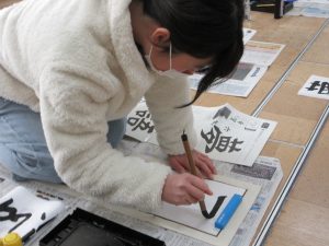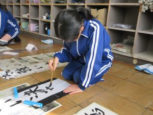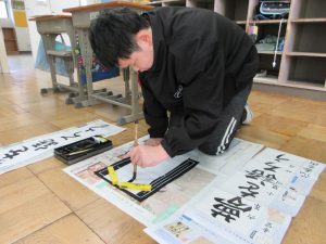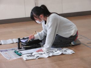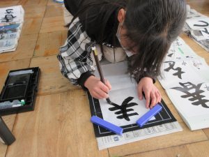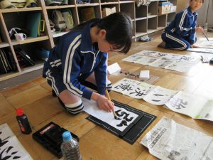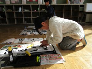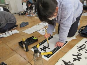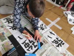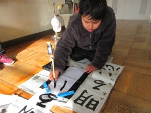 3年生以上は毛筆です。いつもと違う「八つ切り」サイズの紙に、膝をついて書きました。