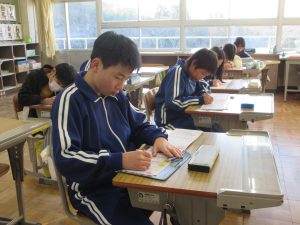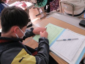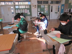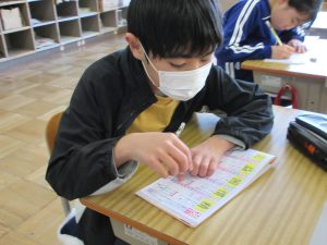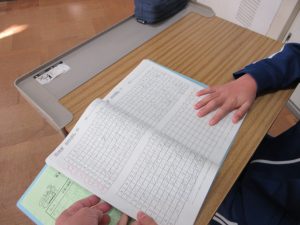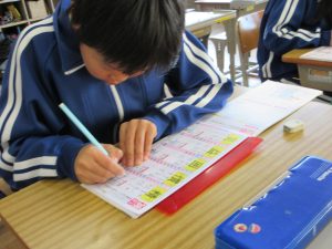 6年生は、掛け算の百ます計算をタイムに挑戦します。計算力はもちろん、集中力、処理能力も鍛えられます。