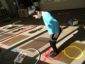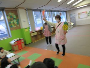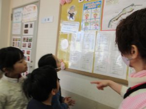 活動した部屋の掲示にも興味をもって、先生と一緒に学ぶ場面もありました。