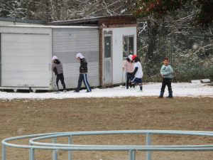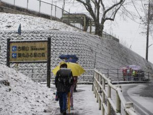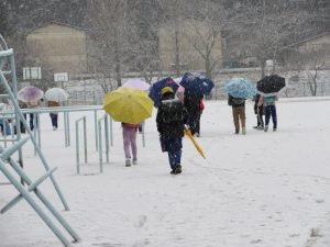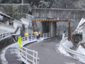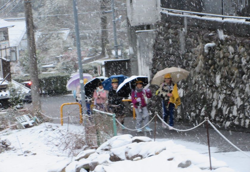 暗いうちに降った雪に加えて、登校時間に合わせて雪が降り始め、傘をさしての城戸坂のぼりになりました。