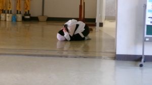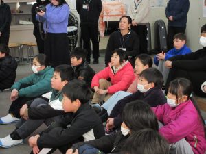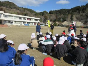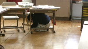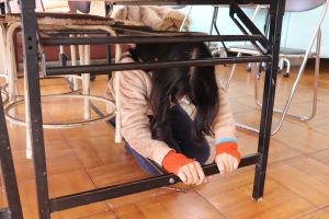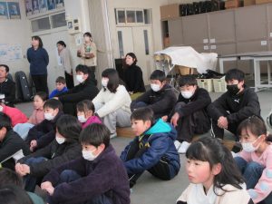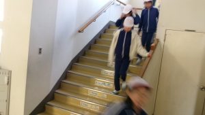 昼休みは、日時を予告しない命を守る訓練を行いました。想定は地震。揺れがおさまるまでそれぞれの活動場所での「一次避難」、揺れがおさまった後の「二次避難」を訓練しました。運動場で遊んでいた子たちは安全な真ん中に集まり低い姿勢に。教室内では「落ちてこない」「たおれてこない」「動いてこない」安全な場所で身を守ります。