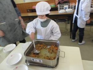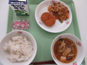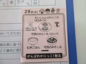 給食週間3日目は「がんばれかにっこ!献立」です。お味噌汁の味噌をはじめ、さといも、大豆、そしてハチミツ・・・など、可児で収穫されたもの満載のメニューをいただきました。