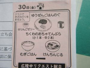 給食週間最終日は、「広陵中学校リクエスト献立」でした。今日もおいしくいただきました。