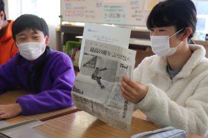 兼山小学校では、NIE(新聞を教材とした活動)に取り組んでいて、1年を通して朝活動の時間に「新聞読み解きタイム」の活動をしています。今朝は、その様子を岐阜新聞社の方が取材にいらっしゃいました。