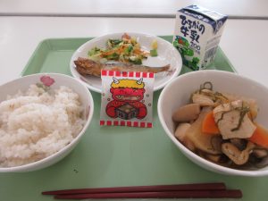 今日の節分献立に豆もありました。イワシの丸干しフライに苦戦しそうです。(ご家庭で感想を聞いてみてください。)