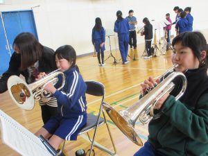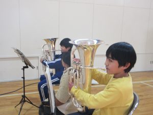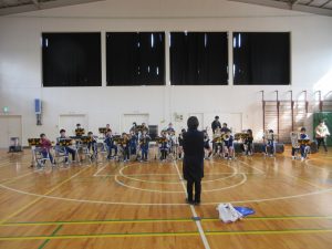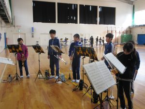 「B昼」です。今日は、ありがとうの会(6年生への感謝の会)での演奏に向けて、会場となる体育館で練習をしました。