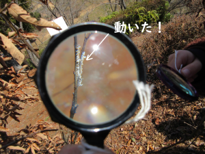 冬の芽を探しに出かけました。紙レンズの真ん中から芽をのぞかせ「どの色に似ているのかな?」と観察しました。