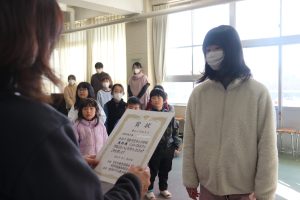 先月行われた可児市の美術展の表彰を行いました。代表で6年生に受け取ってもらいました。