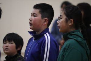 3年生がデビューの「兼山小校歌」で、6年生を送りました。