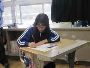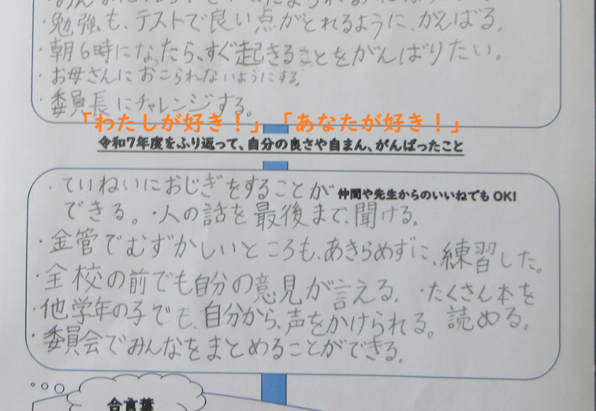 本日お配りしました学校だよりに紹介した、『教えて!あなたの「わたしが好き!」「あなたがが好き!」』の活動を、ラストで5年生が行いました。「1年間を振り返って、自分の良さ自慢、がんばったこと」を書いている場面です。自分のことは書けそうでなかなか文字にできないものです。文字にならなくても、自分見つめに真剣に向かう姿が貴重です。